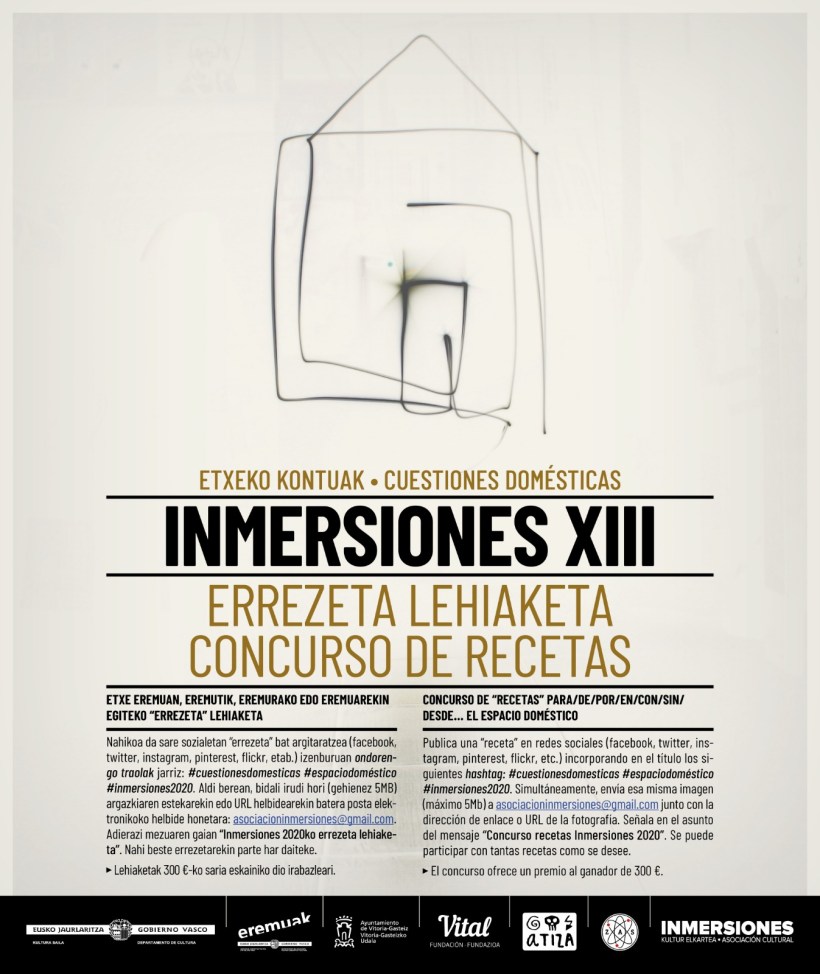 Lehiaketan parte hartzeko, nahikoa da sare sozialetan “errezeta” bat argitaratzea (facebook, twitter, instagram, pinterest, flickr, etab.) izenburuan ondorengo traolak jarriz: #cuestionesdomesticas #espaciodoméstico #inmersiones2020. Aldi berean, bidali irudi hori (gehienez 5MB) argazkiaren estekarekin edo URL helbidearekin batera posta elektronikoko helbide honetara: asociacioninmersiones@gmail.com. Adierazi mezuaren gaian “Inmersiones 2020ko errezeta lehiaketa”. Nahi beste errezetarekin parte har daiteke. Antolakuntzak lehiaketari buruzko epaia jakinarazi ondoren, pertsona irabazleak errezeta eman behar du kalitate onenaz, Inmersiones 2020ko katalogoan sartzeko. Lehiaketak 300 €-ko sari bakarra eskainiko dio irabazleari.