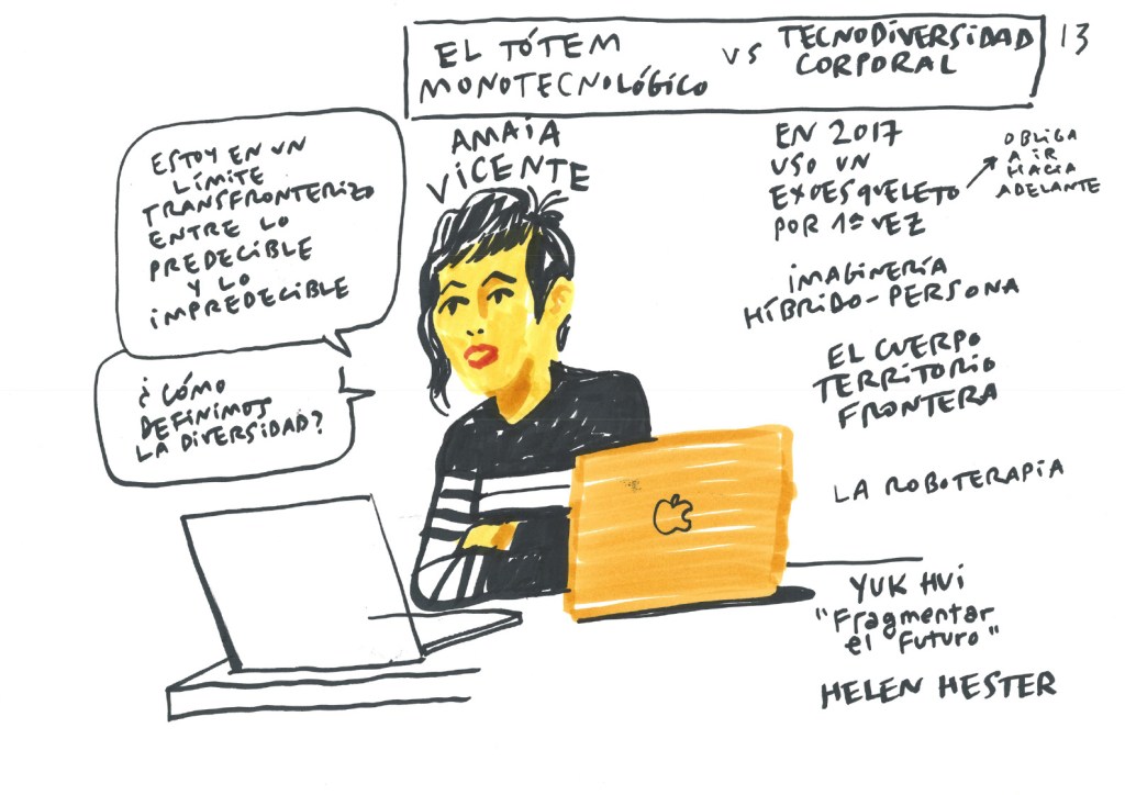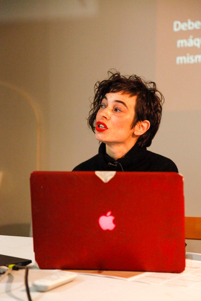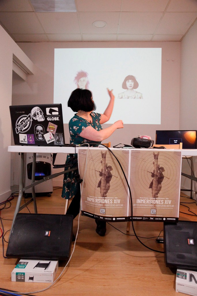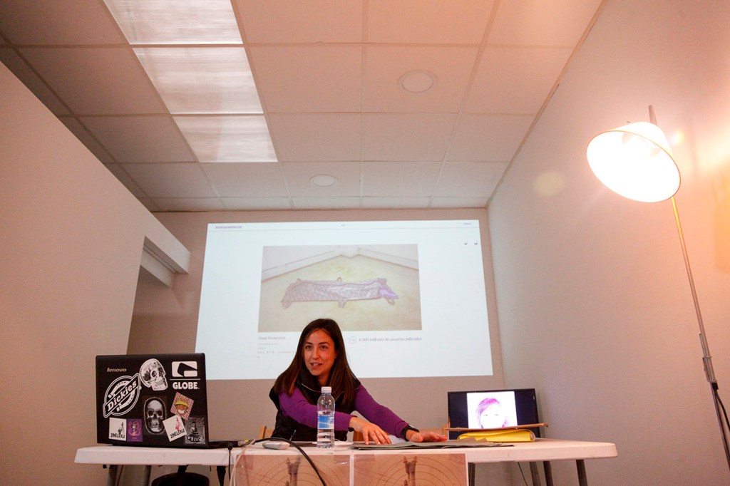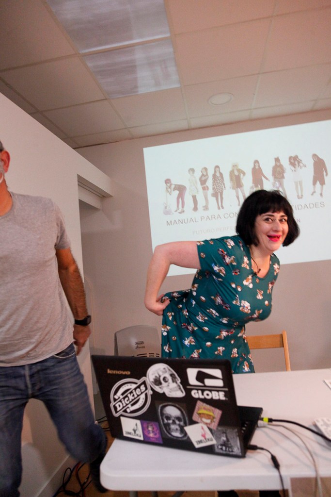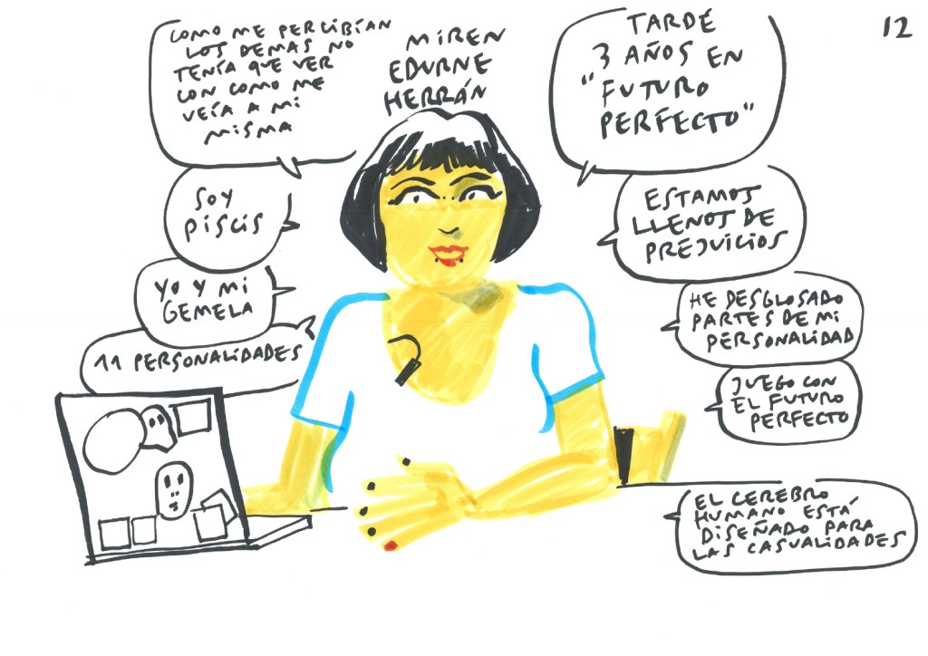 En esta ponencia, la artista hace un recorrido por los múltiples referentes artísticos, fílmicos y musicales, así como toda la investigación en diversas disciplinas (psicología, sociología, antropología…) relativos a su proyecto Futuro perfecto, en el que analiza, desgrana e inventa un sinfín de conceptos asociados a la identidad y reflexiona sobre la construcción social de la misma. A través de lo que denomina ‘experimentos’ (acciones plasmadas de manera artística) y con la ayuda de ciertas prácticas adivinatorias tales como servicios de clarividencia, tarot y quiromancia, construye once posibles relatos (futuros).